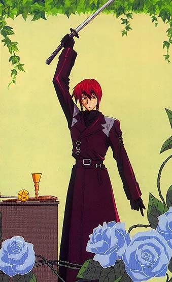 Appearence: Red hair that is short in the back and has to dogtail in the front with bangs, his eyes are violet and he wears trenchcoats almost all the time!!! He also carries a Katana with him often. Also he has a long gold earing in his left ear.